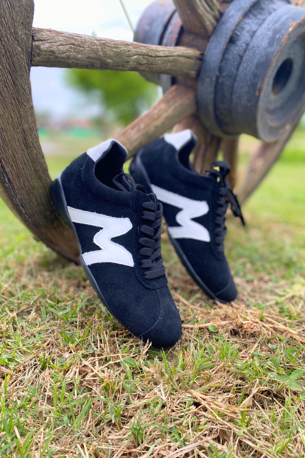 Zapatilla de cuero de Gamuza vacuno con toques en cuero liso, confeccionada en una base de goma de TR súper flexible y muy liviana. Se completa con caraceterísticas clásicas como costuras y cordones al tono