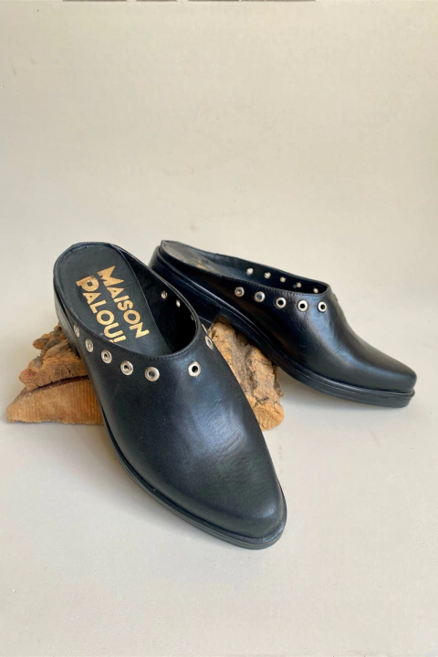 Zueco de cuero vacuno, sobre base de goma eva en punta de 2 cm. Ideal para esos días no tan frescos, que necesitas estar arreglada y bien liviana!